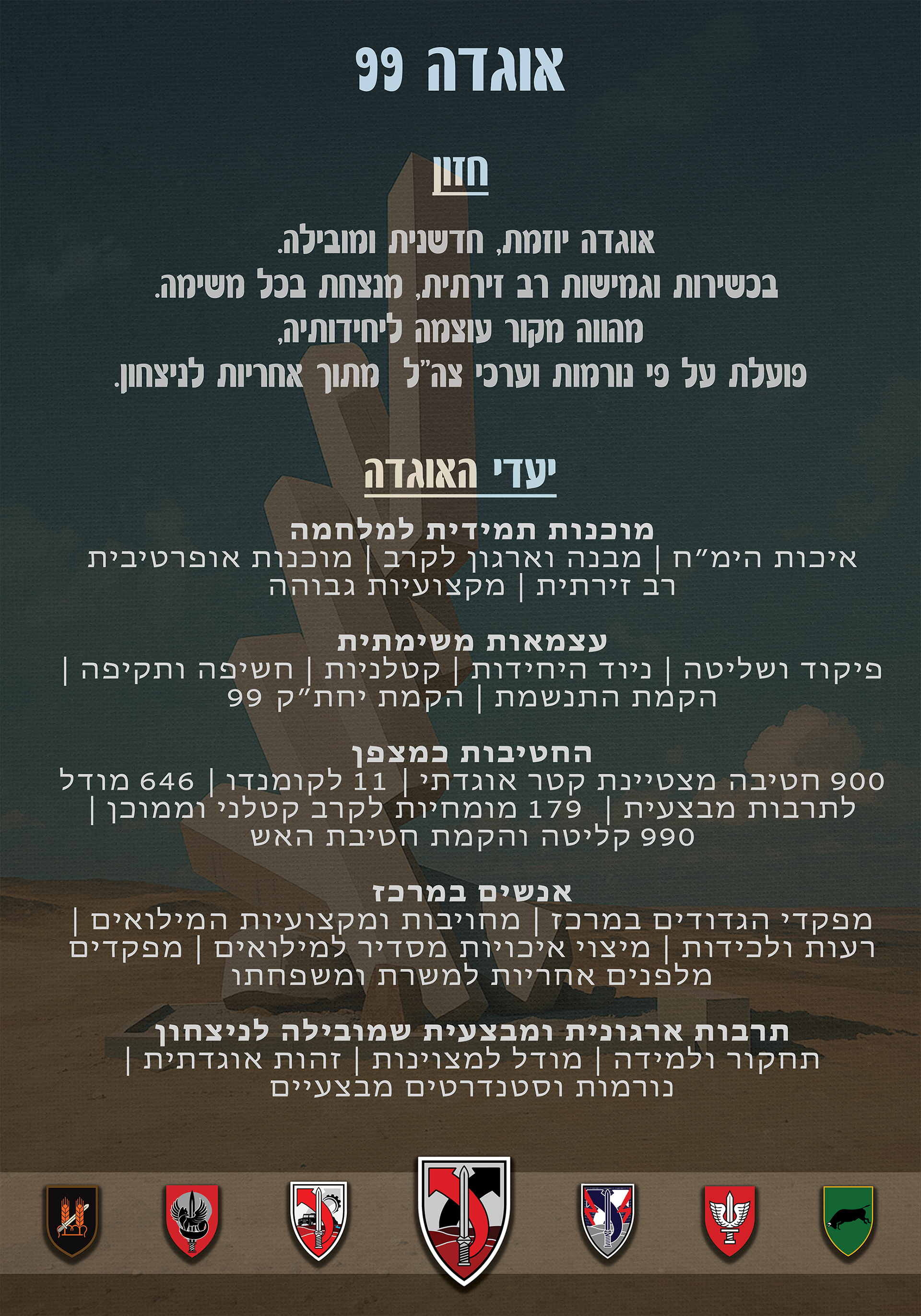 על גבי הפוסטר שולבו סמלי החטיבות השונות של האוגדה, לצד סידור מידע היררכי ונקי שמאפשר הצגה ברורה של הנתונים המרכזיים – ייעוד האוגדה, יכולותיה והמבנה הארגוני שלה